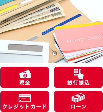 まとまったお支払いなどでもご不便のないよう、お客様のご都合に合わせた様々な形のお支払いを承っております。現金、銀行振込はもちろん、各種クレジットカードでのお支払い、またオートローンのご利用も可能です。ご不明点はどうぞご遠慮無くお尋ねください。